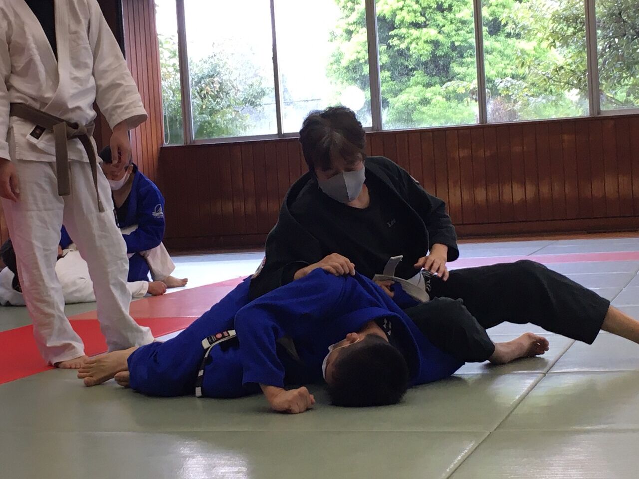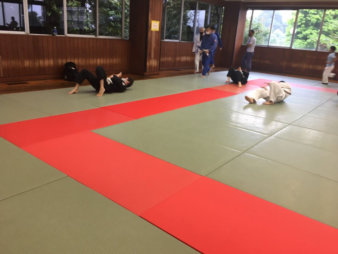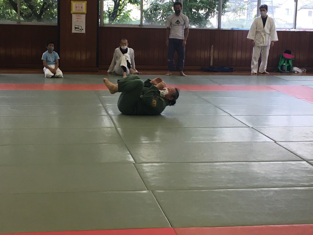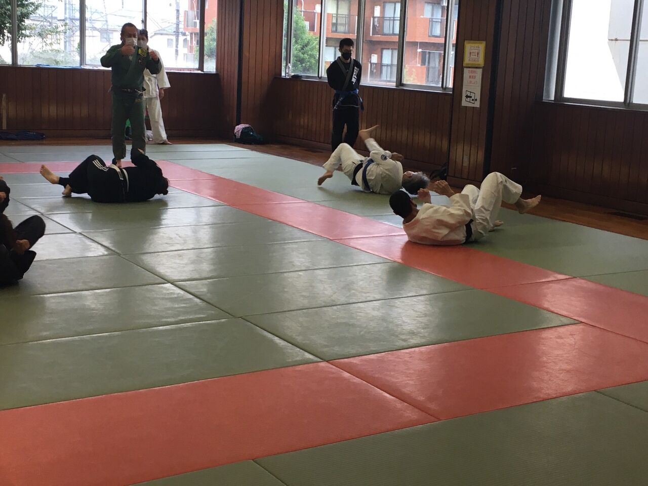 練習は、ソーシャルディスタンスや熱中症に注意しつつ、休憩を多めにし、休憩時には参加の皆さんにお手伝いいただき、窓を全開にして柔道場内の換気を行いました。