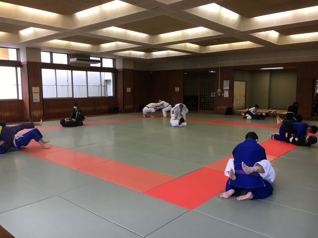 初参加の方1人、キッズ1人、女性4人を含む白帯11人、青帯5人、紫帯1人、茶帯3人の計20人で練習しました。