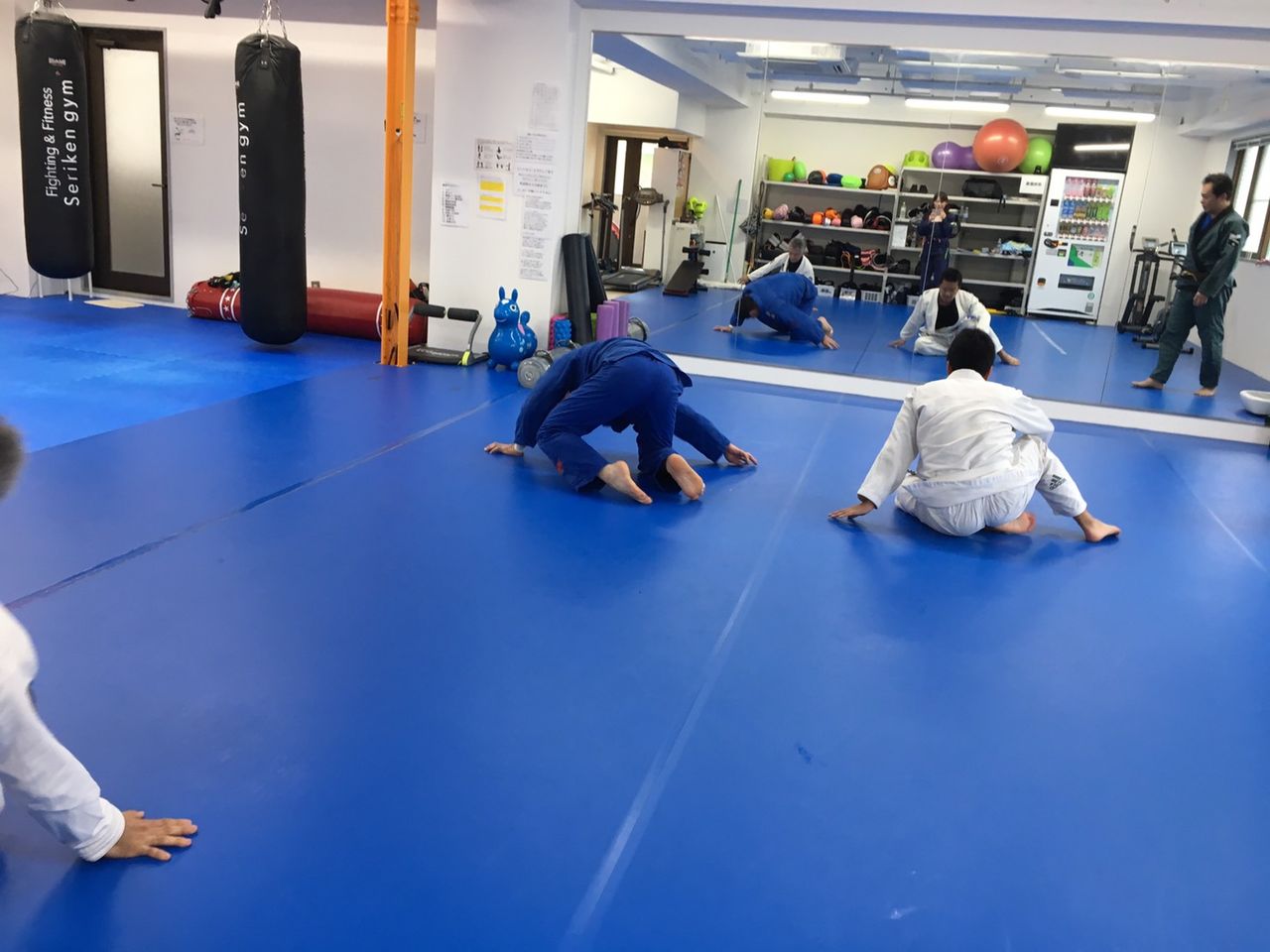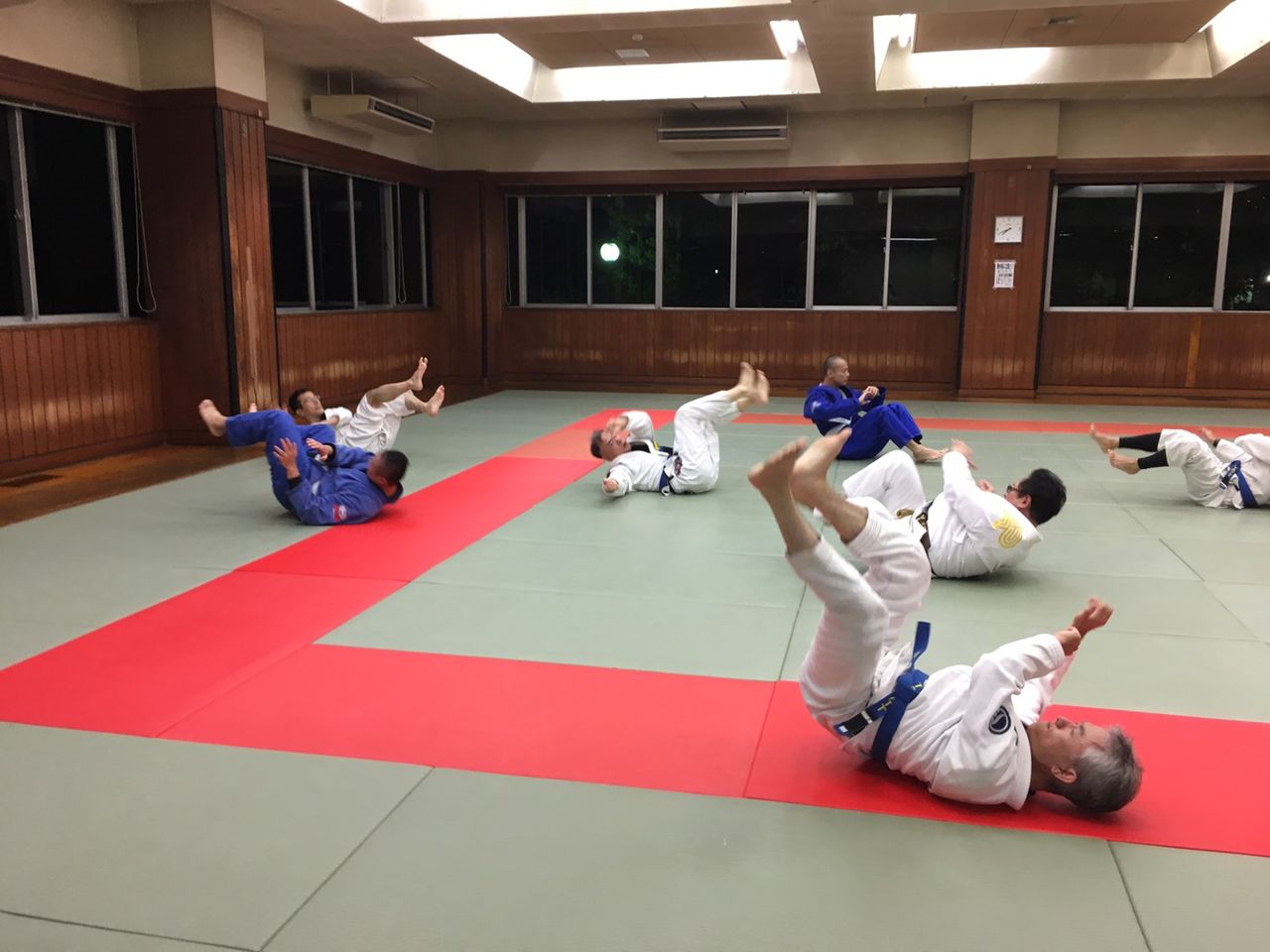 1、練習内容は、軽く走ることから始まり、柔軟運動、エビなどの基礎運動、基本的な打ち込み、テクニック(技研究)、スパーリング(5本くらい)です。無理せず、出来ることだけやっていただいて構いません。